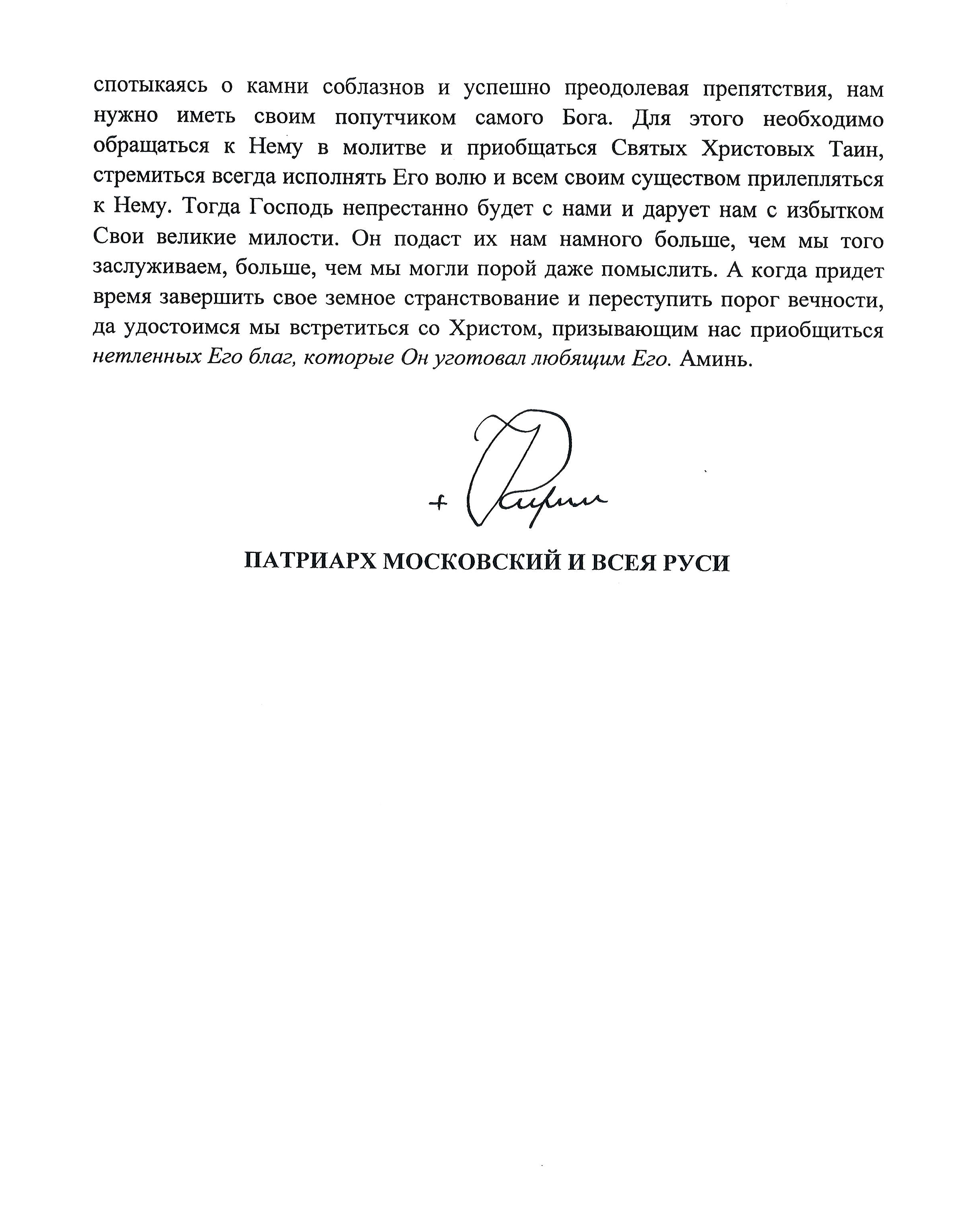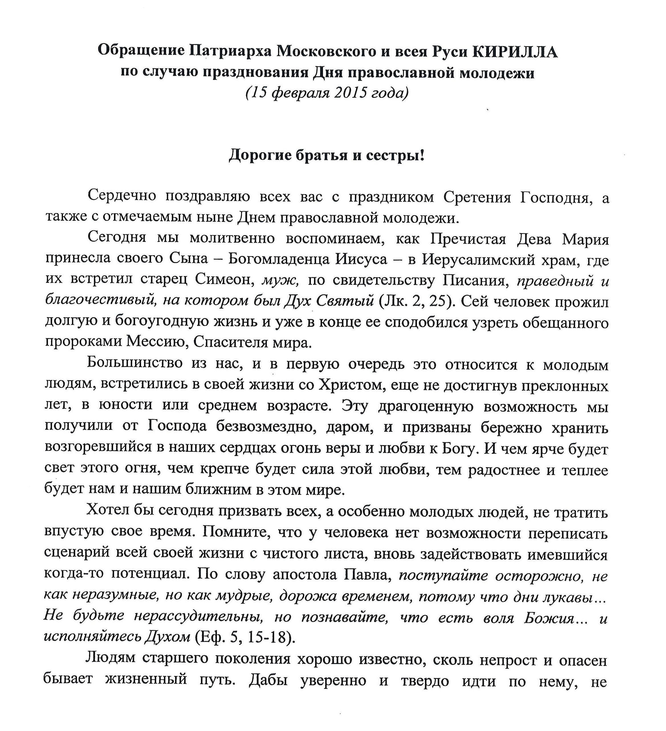 По благословению Святейшего Патриарха Московского и всея Руси Кирилла, всему духовенству полагается 15 февраля за Божественной литургией зачитать Патриаршее обращение по указанному случаю:
