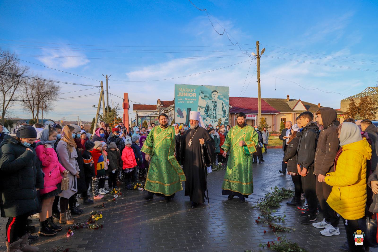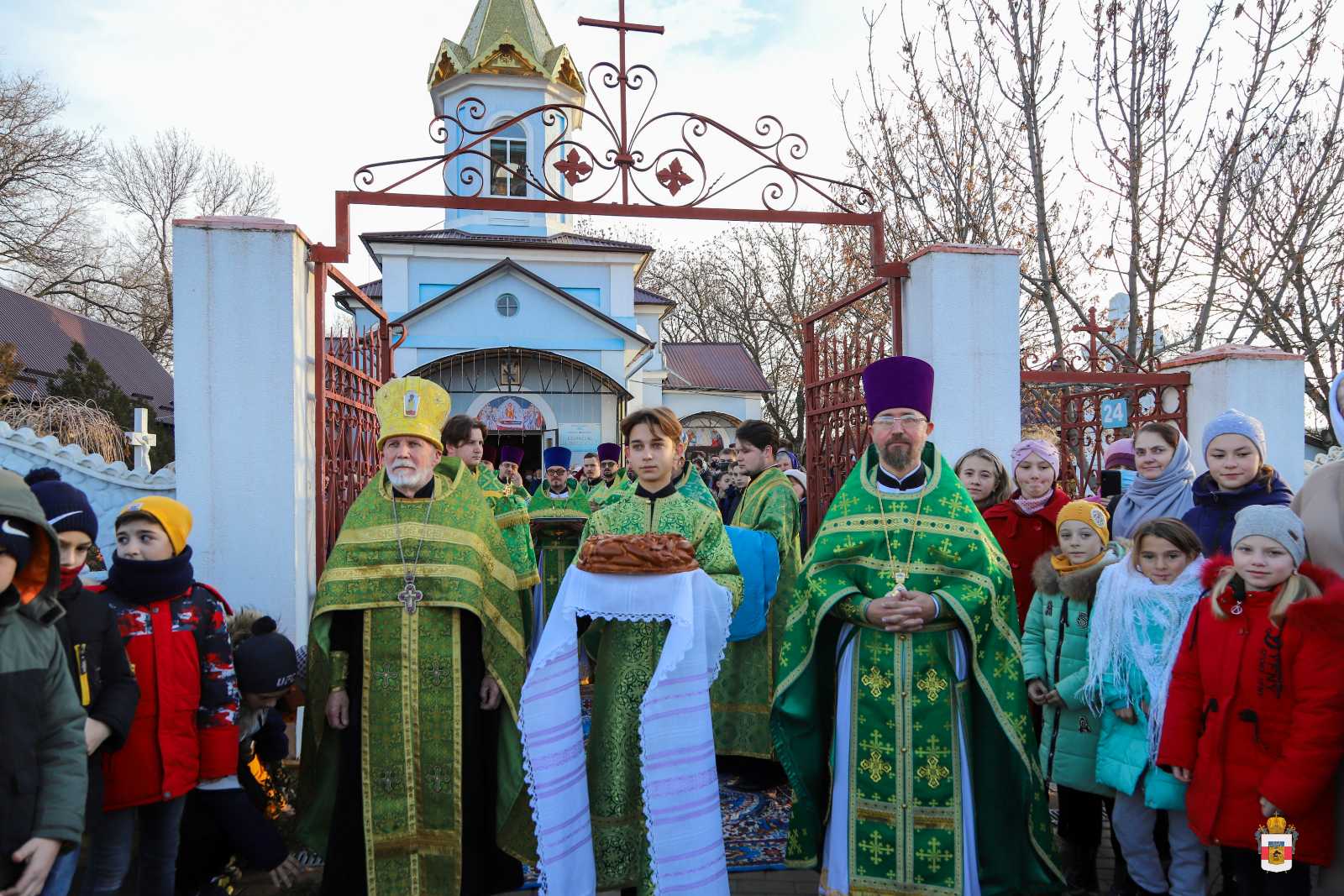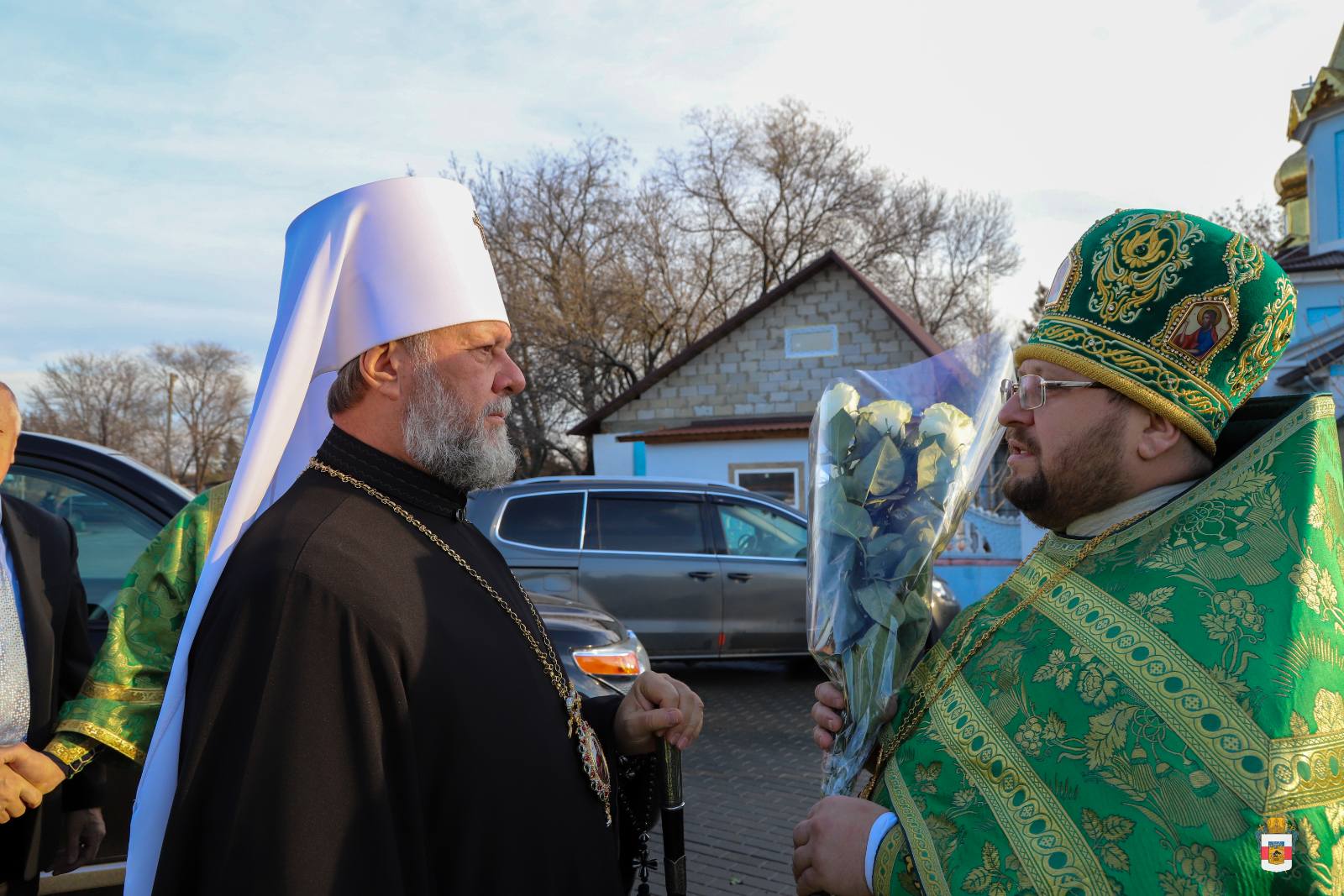 Перед началом богослужения, Предстоятеля Православной Церкви Молдовы торжественно встречали у врат храма группа детей, одетых в национальные костюмы, с осенними цветами в руках, и благочинный церквей Каушанского района митрофорный протоиерей Василий Дамаскин вместе настоятелем Успенского храма протоиереем Николаем Желиховским с традиционным хлебом-солью.