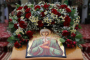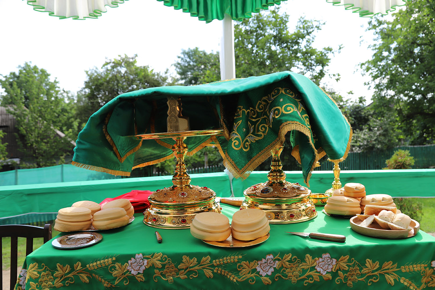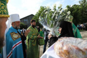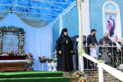 Перед началом Литургии, рано по утру, была установлена перед храмом на специальном постаменте рака с честными мощами блаженной угодницы Божией. Духовенство обители вместе с собором священнослужителей совершили службу Утрени. Далее, последовало служение Божественной литургии.
