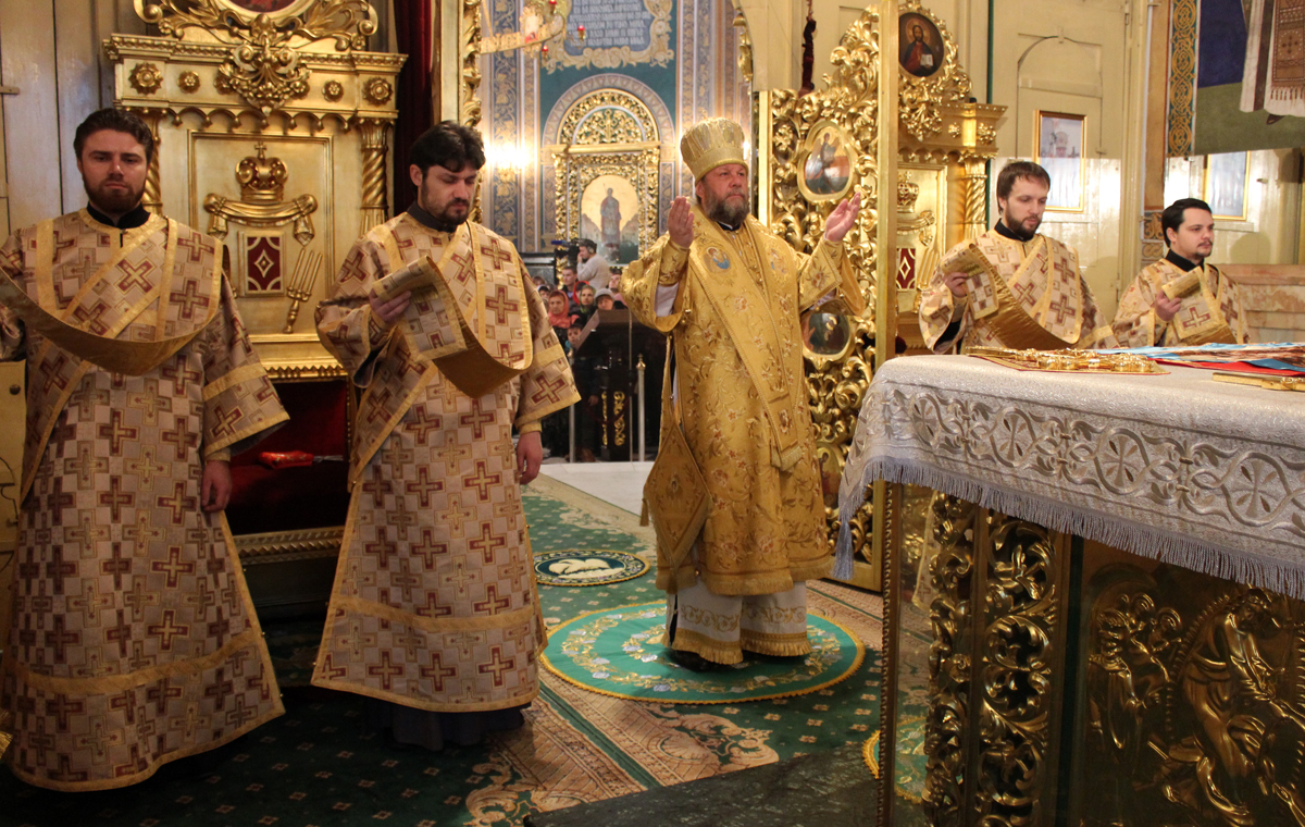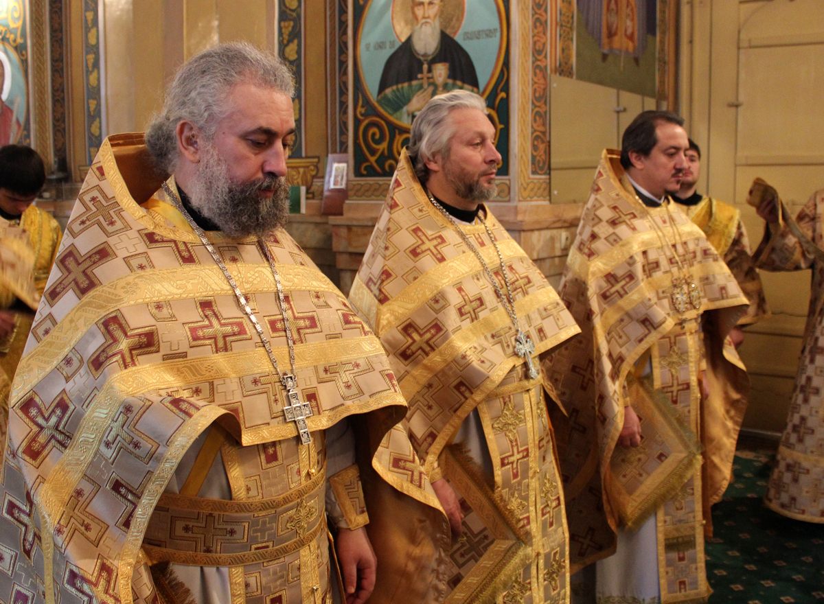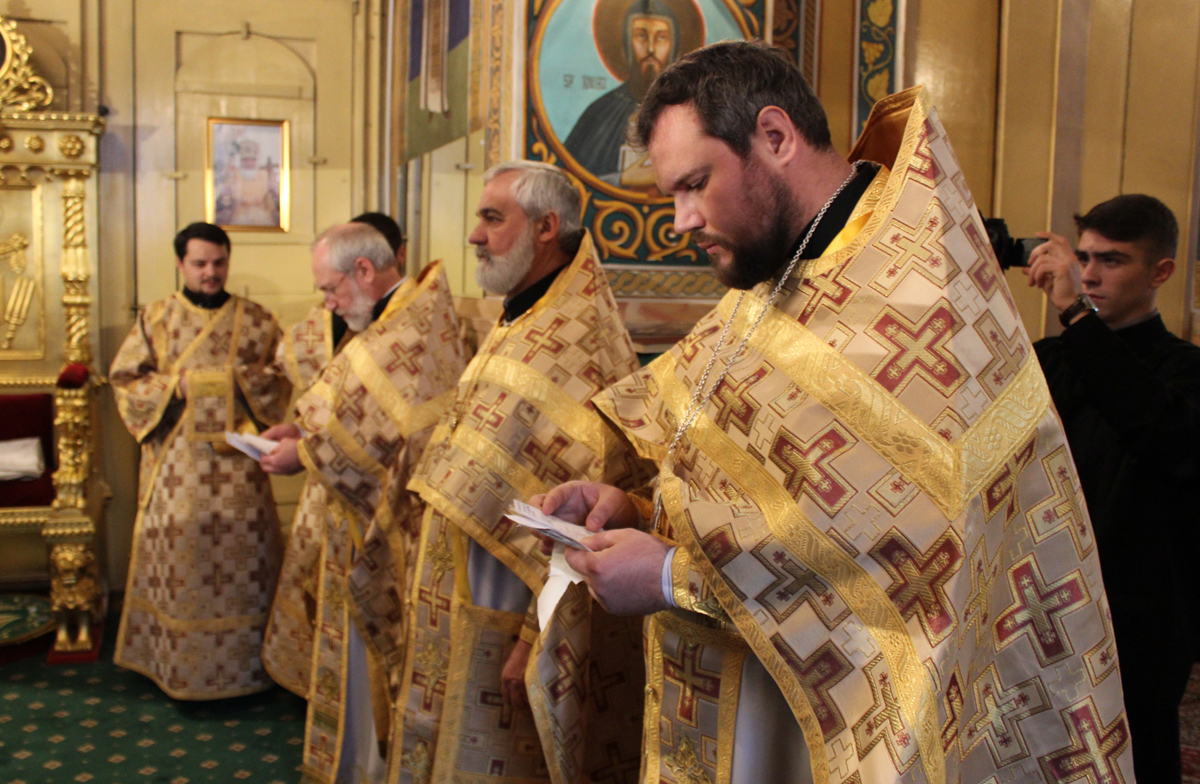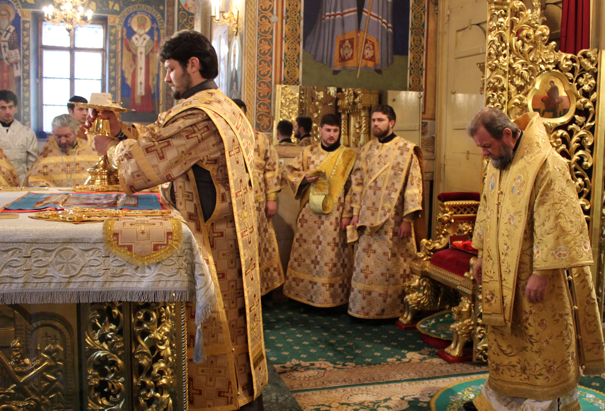 Его Высокопреосвященству сослужили: митрофорный протоиерей Вадим Кейбаш, секретарь Кишиневско-Молдавской Митрополии, протоиерей Андрей Секрий, настоятель Михайло-Архангельского храма с. Трушены, Кишиневского мун-я, игумен Трифон (Чобану), насельник Свято-Вознесенского Ново-Нямецкого Кицканского мужского монастыря, соборное духовенство.