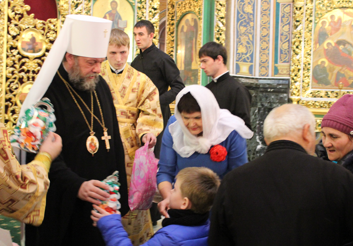 По сложившейся доброй традиции, в день памяти святителя Николая Чудотворца, Высокопреосвященный Митрополит Владимир по окончании Литургии раздает детям ценные дары. И в этом году, все присутствующие дети получили из рук архипастыря благословения и сладости.