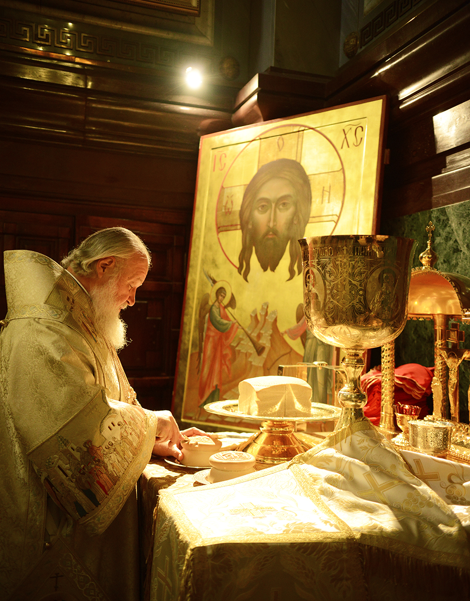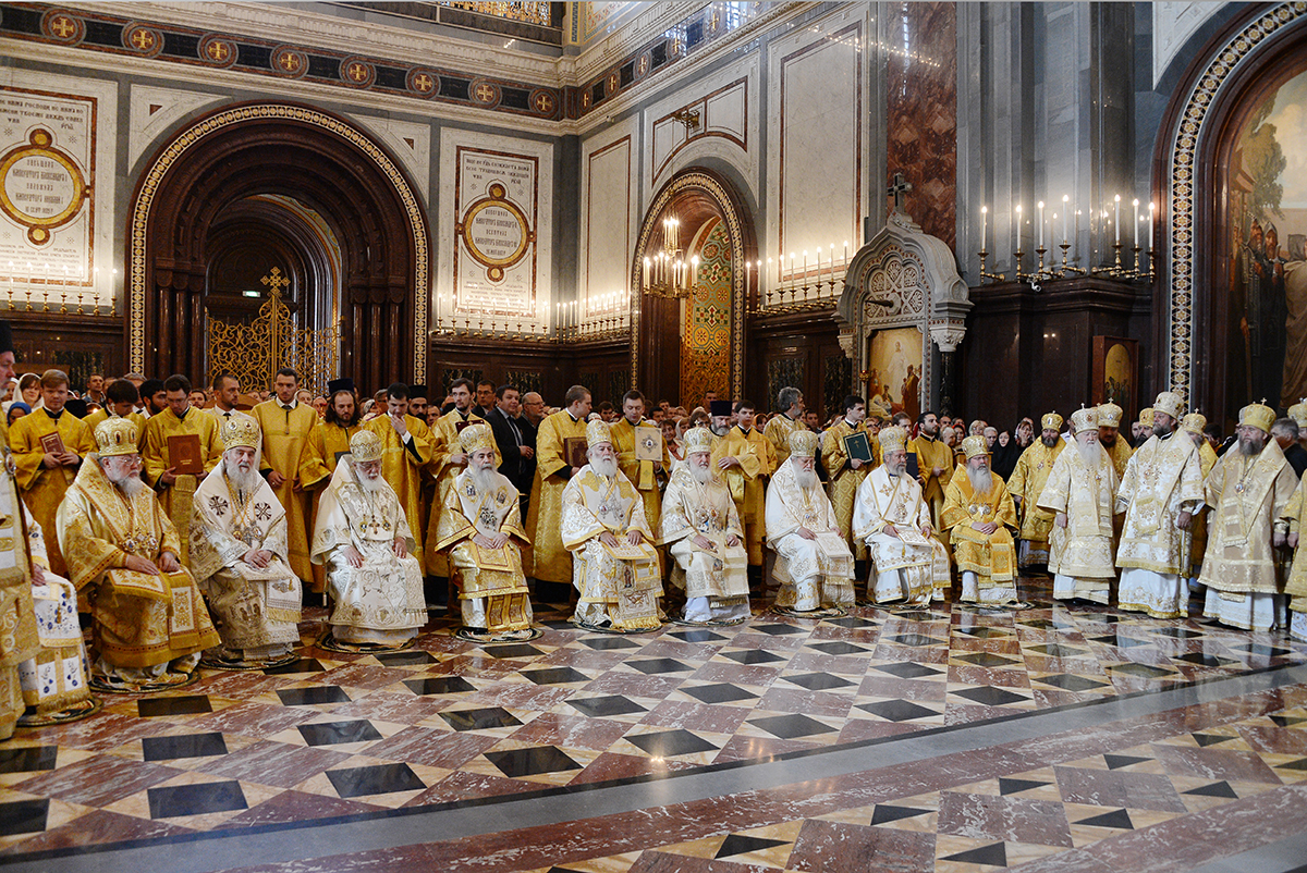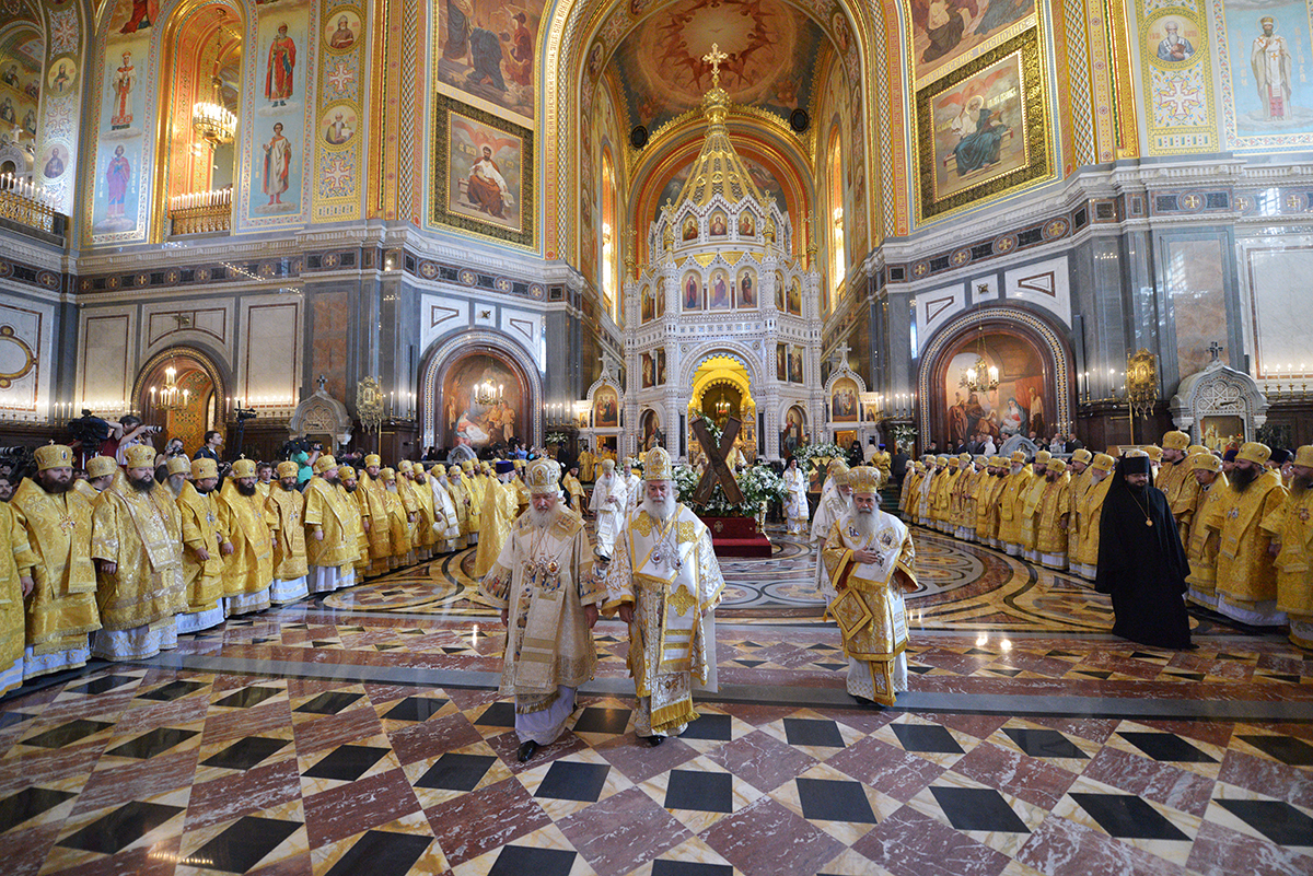 Литургию служили Блаженнейший Патриарх Александрийский и всей Африки Феодор, Блаженнейший Патриарх Святого Града Иерусалима и всей Палестины Феофил III, Святейший Патриарх Московский и всея Руси Кирилл, Святейший и Блаженнейший Католикос-Патриарх всея Грузии Илия II, Святейший Патриарх Сербский Ириней, Святейший Патриарх Болгарский Неофит, Блаженнейший Архиепископ Новой Юстинианы и всего Кипра Хризостом II, Блаженнейший Митрополит Варшавский и всей Польши Савва и Блаженнейший Митрополит всей Америки и Канады Тихон, прибывшие в пределы Русской Православной Церкви для участия в торжествах по случаю празднования 1025-летия Крещения Руси.