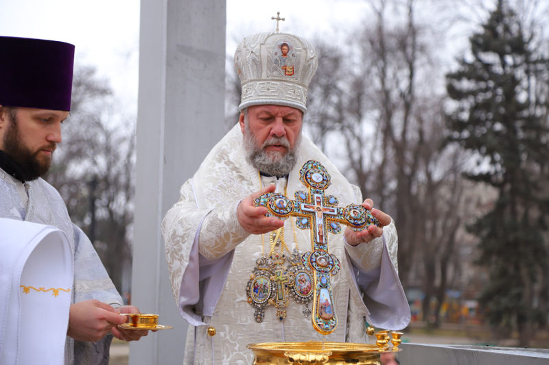 По окончании Литургии на соборной площади Высокопреосвященный Митрополит Владимир совершил чин великого освящения воды и окропил всех молящихся великой агиасмой под пение тропаря праздника Богоявления.