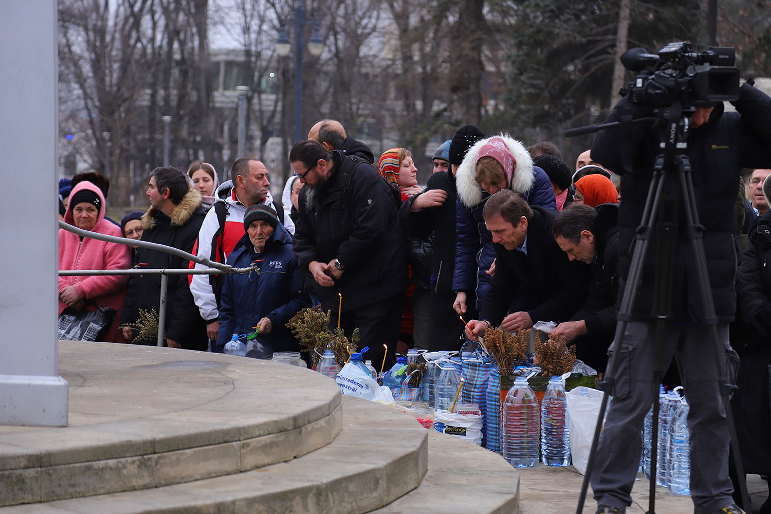 По окончании Литургии на соборной площади Высокопреосвященный Митрополит Владимир совершил чин великого освящения воды и окропил всех молящихся великой агиасмой под пение тропаря праздника Богоявления.