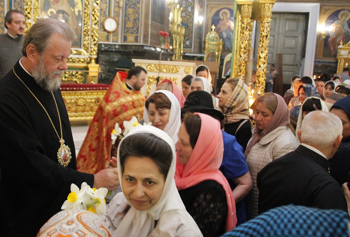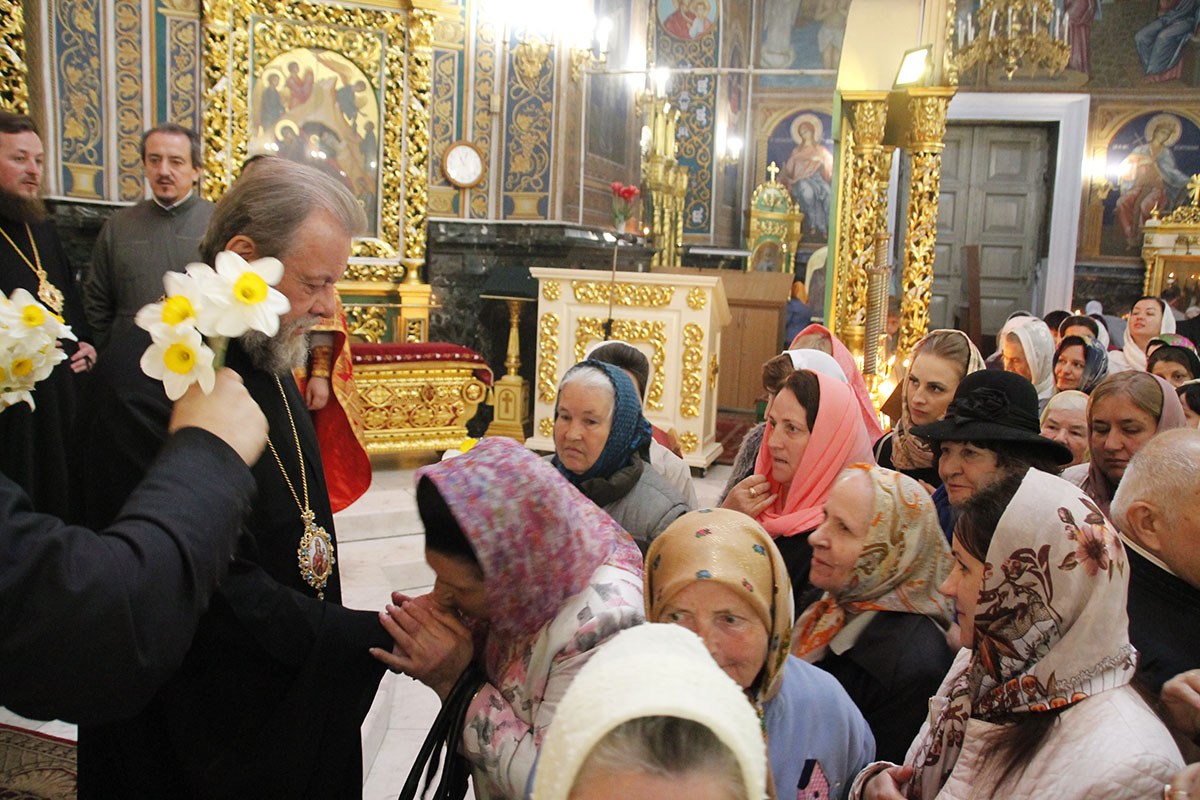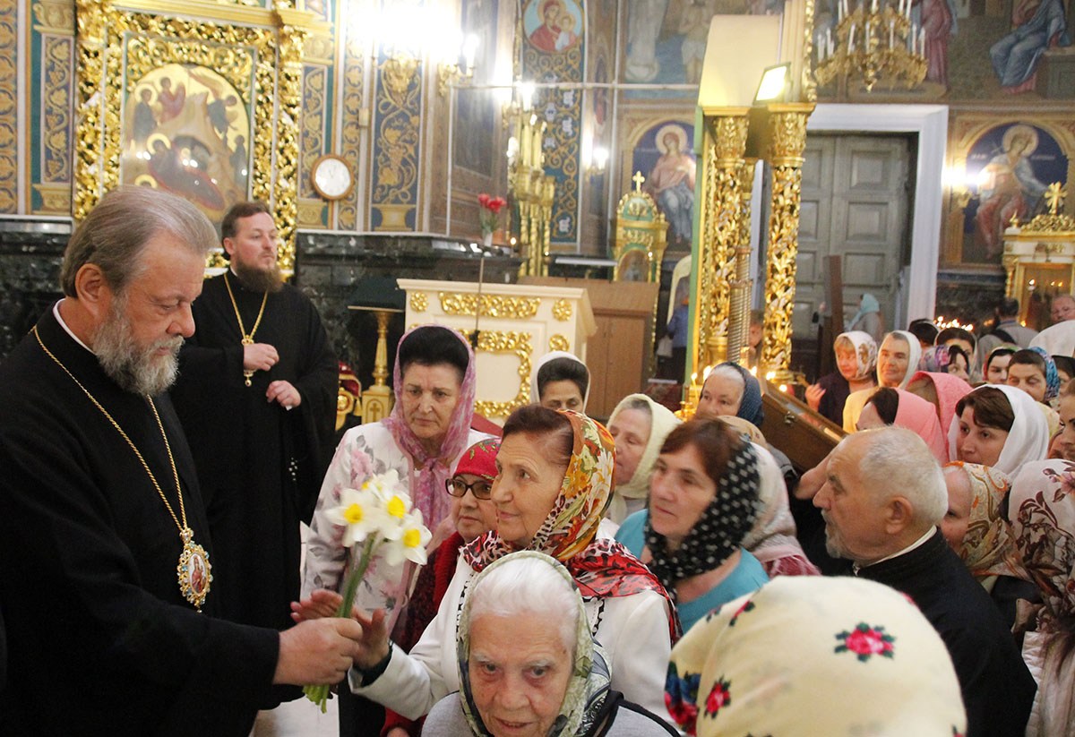 Все женщины получили из рук архипастыря по букету весенних цветов.