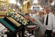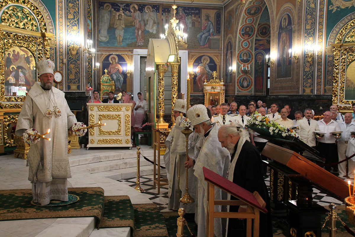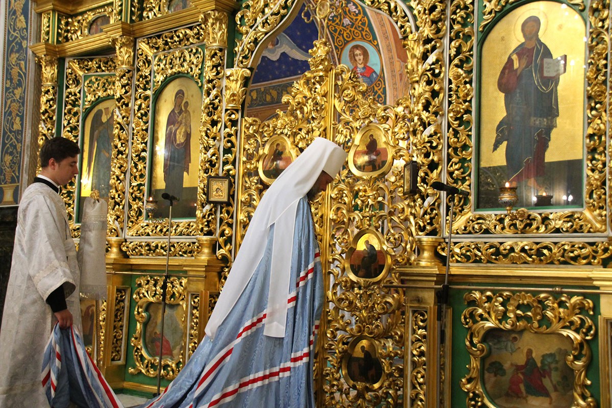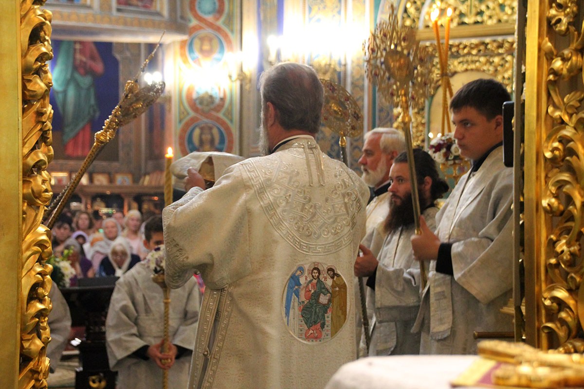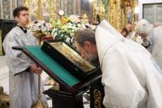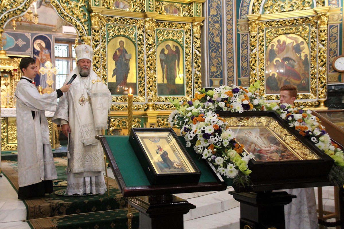 Перед началом Божественной литургии в Высокопреосвященный Владыка Митрополит доставил в собор икону с частицей честных мощей святого праведного воина Федора Ушакова. Святыню торжественно встречали священнослужители и богомольцы кафедрального собора.