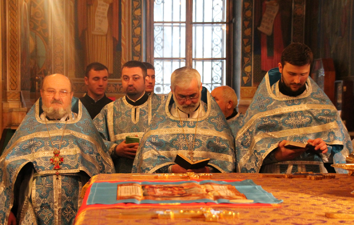 Его Высокопреосвященству сослужили: Преосвященный епископ Сорокский Иоанн, викарий Кишиневской епархии, митр. прот. Вадим Кейбаш, секретарь Кишиневско-Молдавской Митрополии, иеромонах Хризостом (Панас), настоятель Свято-Вознесенского храма г. Кишинева, прот. Юрий Плэмэдялэ, настоятель Покровского храма г. Яловены, соборное духовенство.
