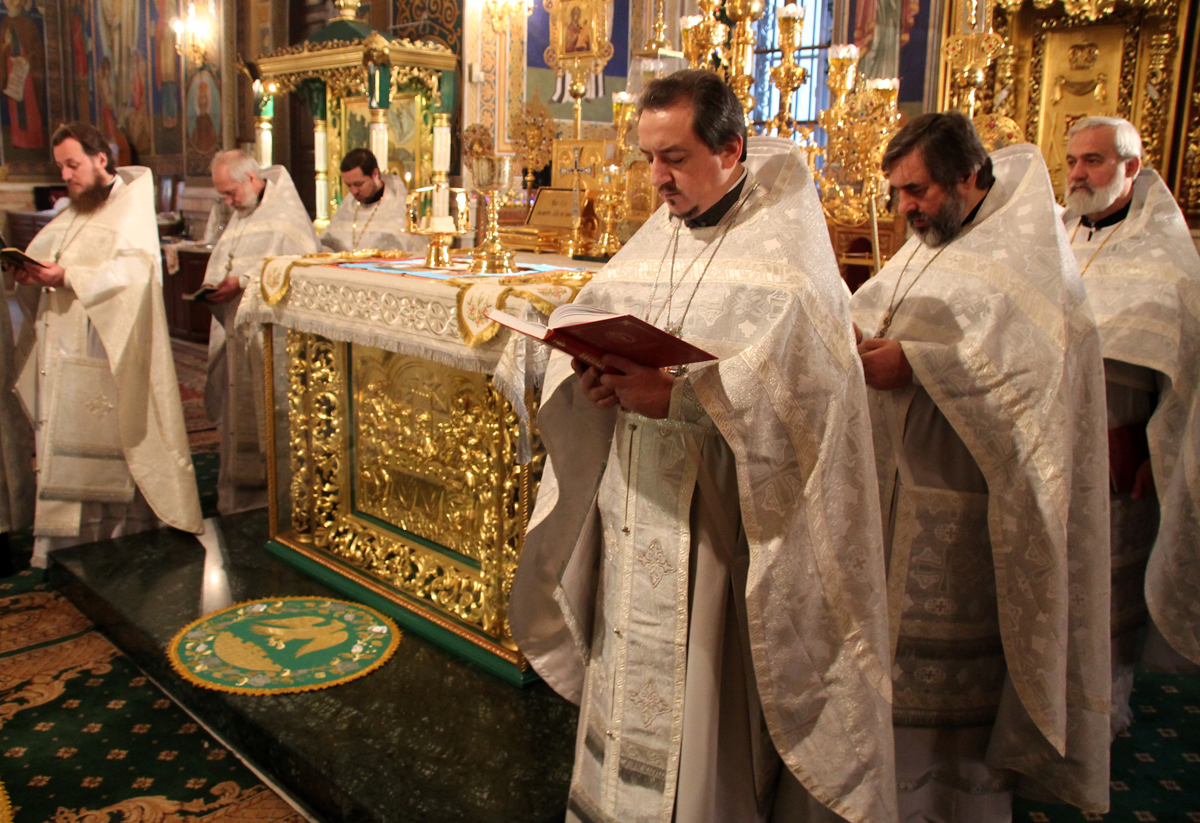 Его Высокопреосвященству сослужили: секретарь Митрополии митрофорный протоиерей Вадим Кейбаш, архимандрит Иоанн (Мошнегуцу), избранный и нареченный во епископа Сорокского, викария Кишиневской епархии, а также соборное духовенство.