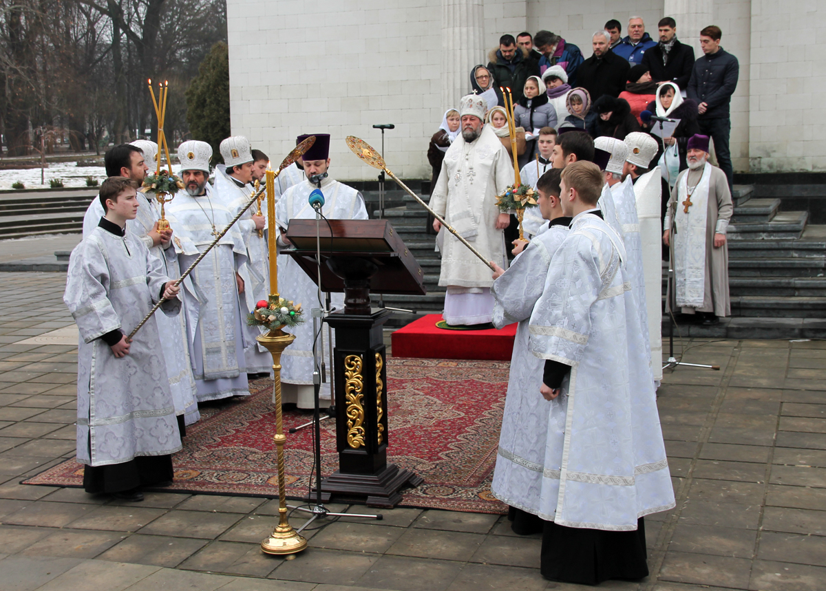 По окончании Литургии при пении тропарей «Глас Господень на водах» священнослужители вышли на соборную площадь, где Высокопреосвященный владыка Митрополит совершил великое освящение воды.