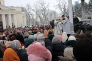 По заамвонной молитве при пении тропарей «Глас Господень на водах» священнослужители вышли на соборную площадь перед специально устроенной «Иорданью», где было совершено великое освящение воды.