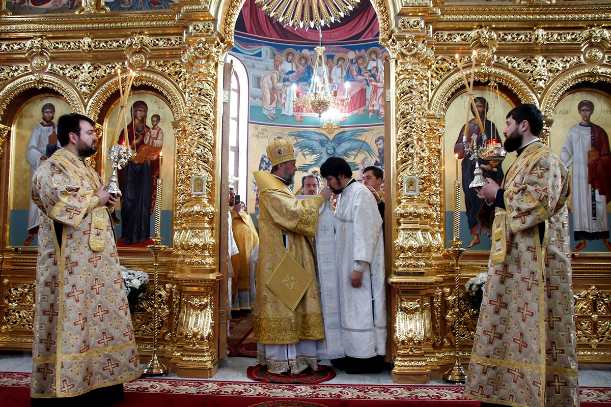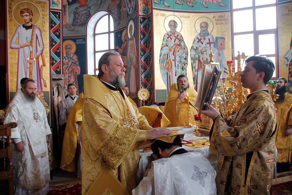 За Литургией Высокопреосвященный Митрополит Владимир совершил иерейскую хиротонию над студентом Кишиневской духовной академии диаконом Ринатом Галимовым для Марфо-Мариинского женского монастыря.