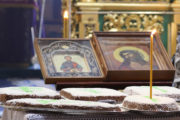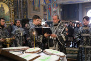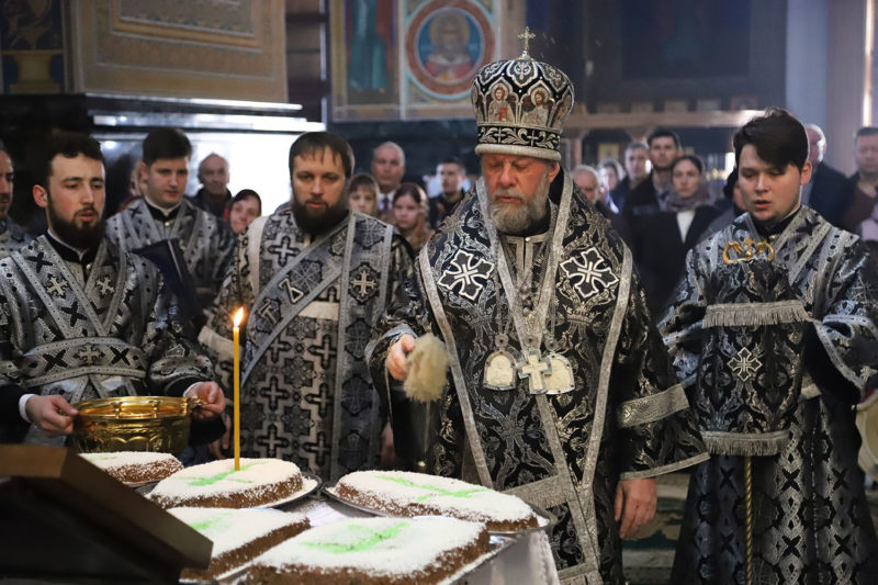 По заамвонной молитве Высокопреосвященный Владыка совершил молебный канон великомученику Феодору Тирону и благословение колива.