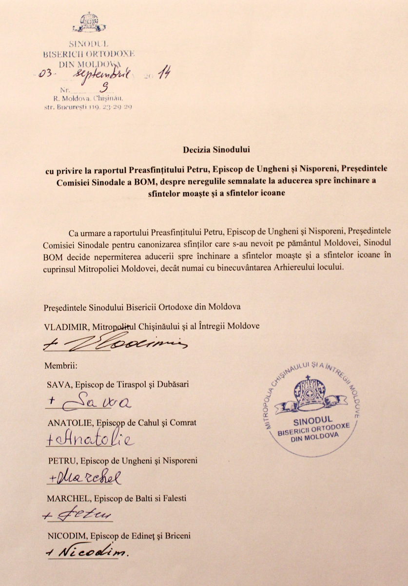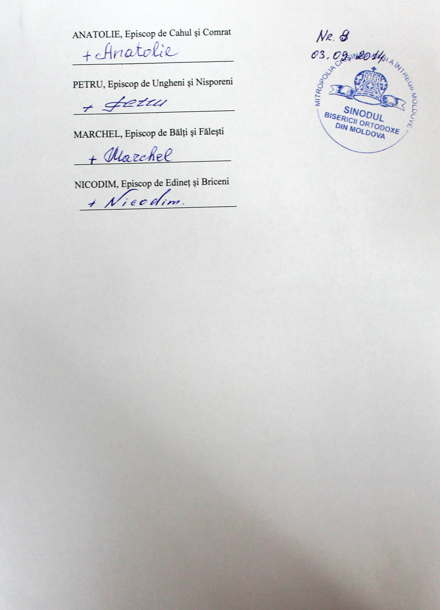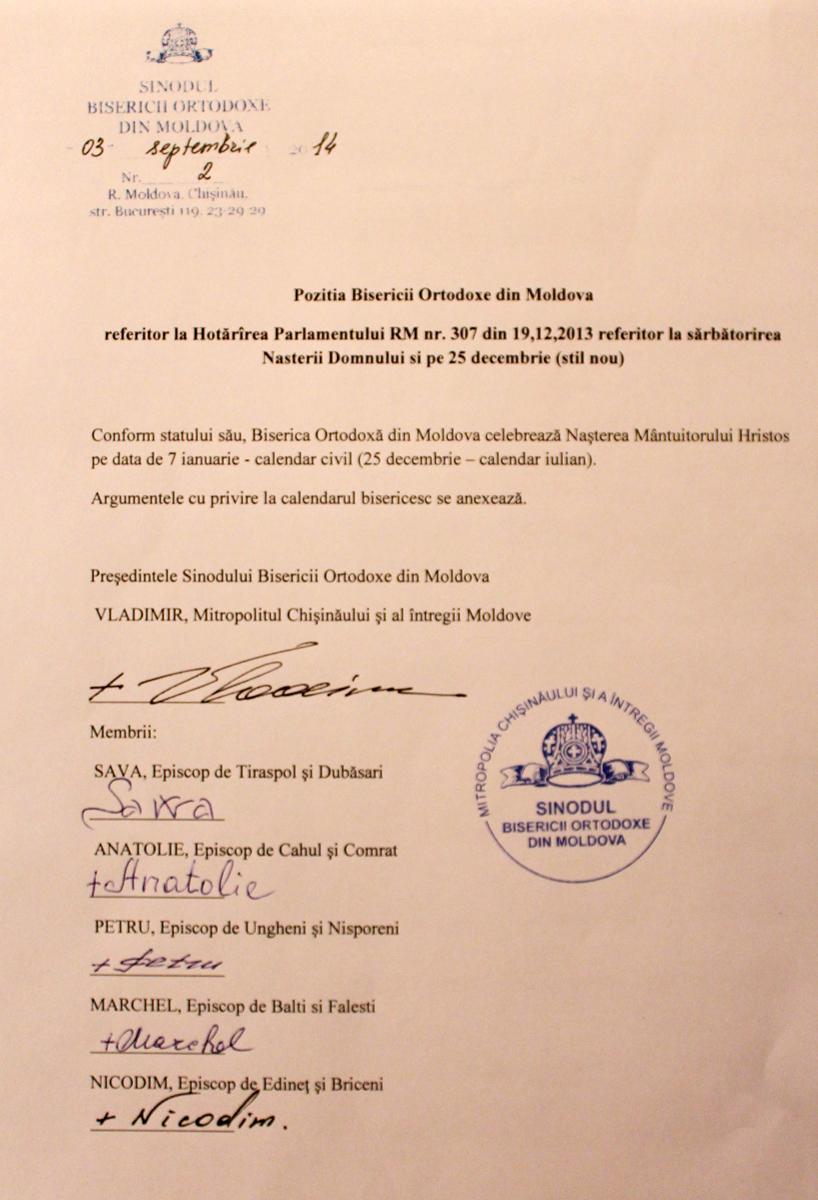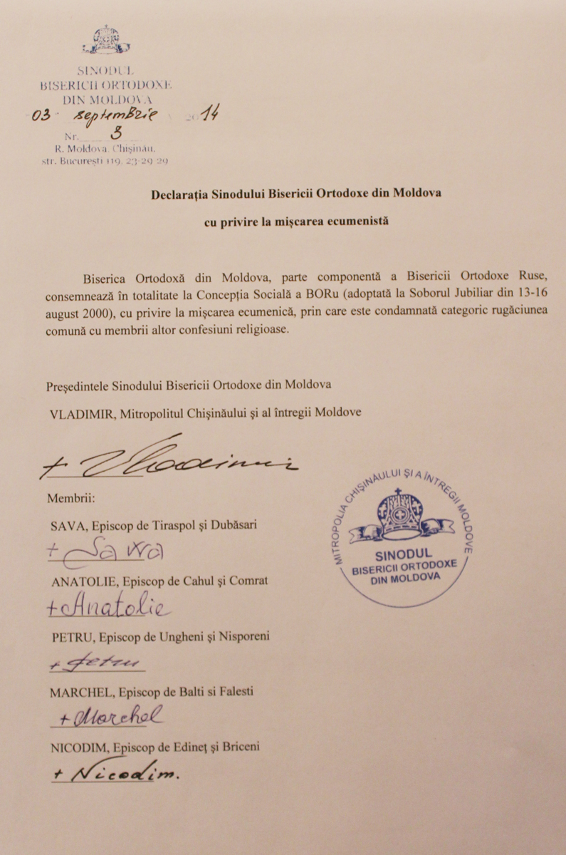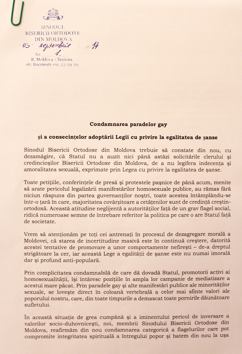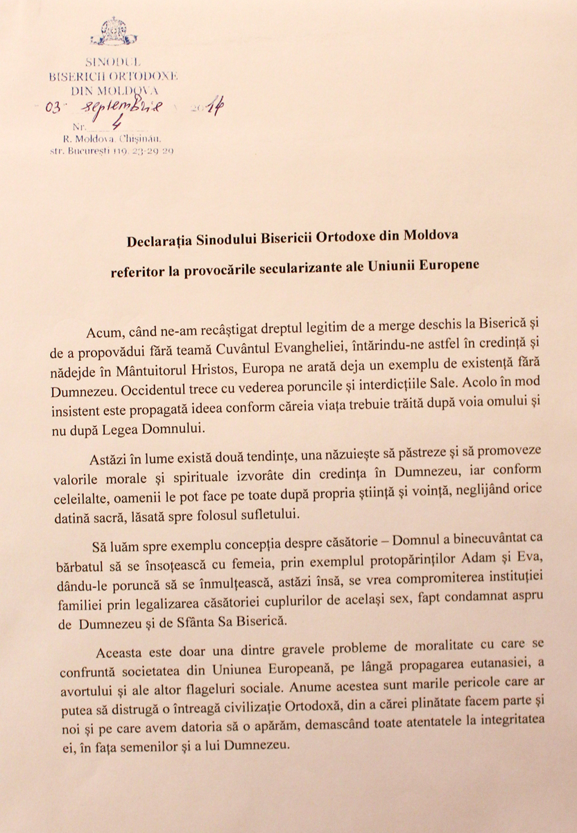 «При соучастии государства, достойном осуждения, активные проводники гомосексуализма укрепляют свои позиции и проводят широкие медийные кампании по продвижению этого великого греха. Посредством гей-парадов и публичных манифестаций сексуальных меньшинств наносится удар по хребту святейших ценностей нашего народа, который во все времена разоблачал все вредные для души позывы», — говорится в документе, опубликованном 4 сентября 2014 года на сайте Молдавской митрополии.