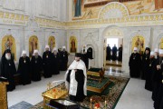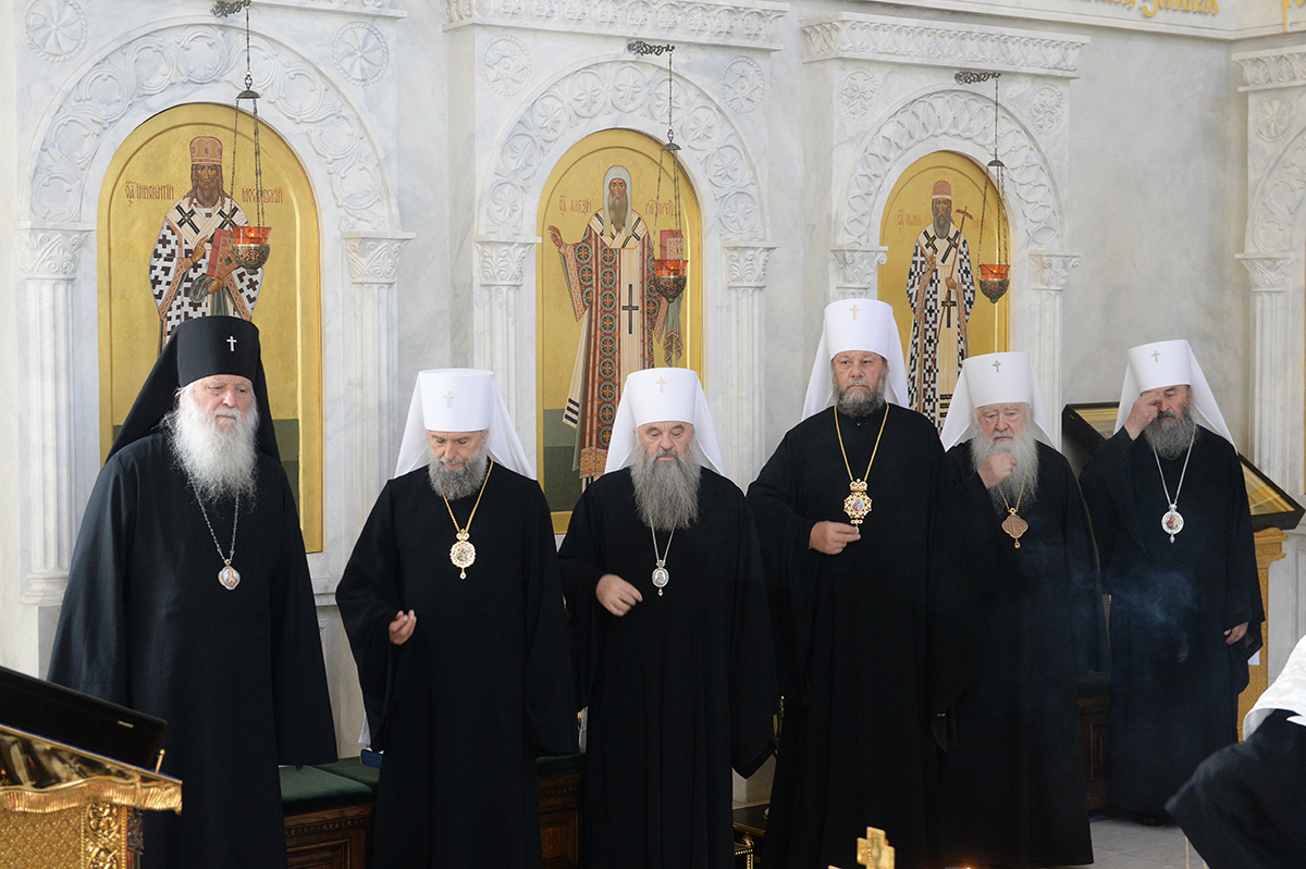 Перед началом заседания Святейший Патриарх Кирилл и члены Священного Синода прошли в крестовый храм Патриаршей резиденции, освященный в честь Всех святых, в земле Русской просиявших, и помолились за литией по новопреставленнному митрополиту Киевскому и всея Украины Владимиру.