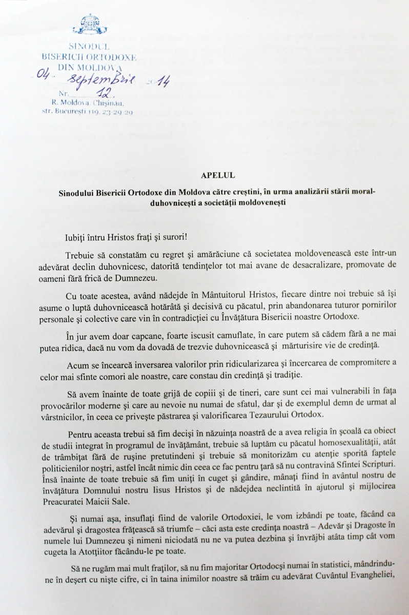 — заявление Синода Православной Церкви Молдовы относительно процессов секуляризации человеческого общества в Европейском Союзе;