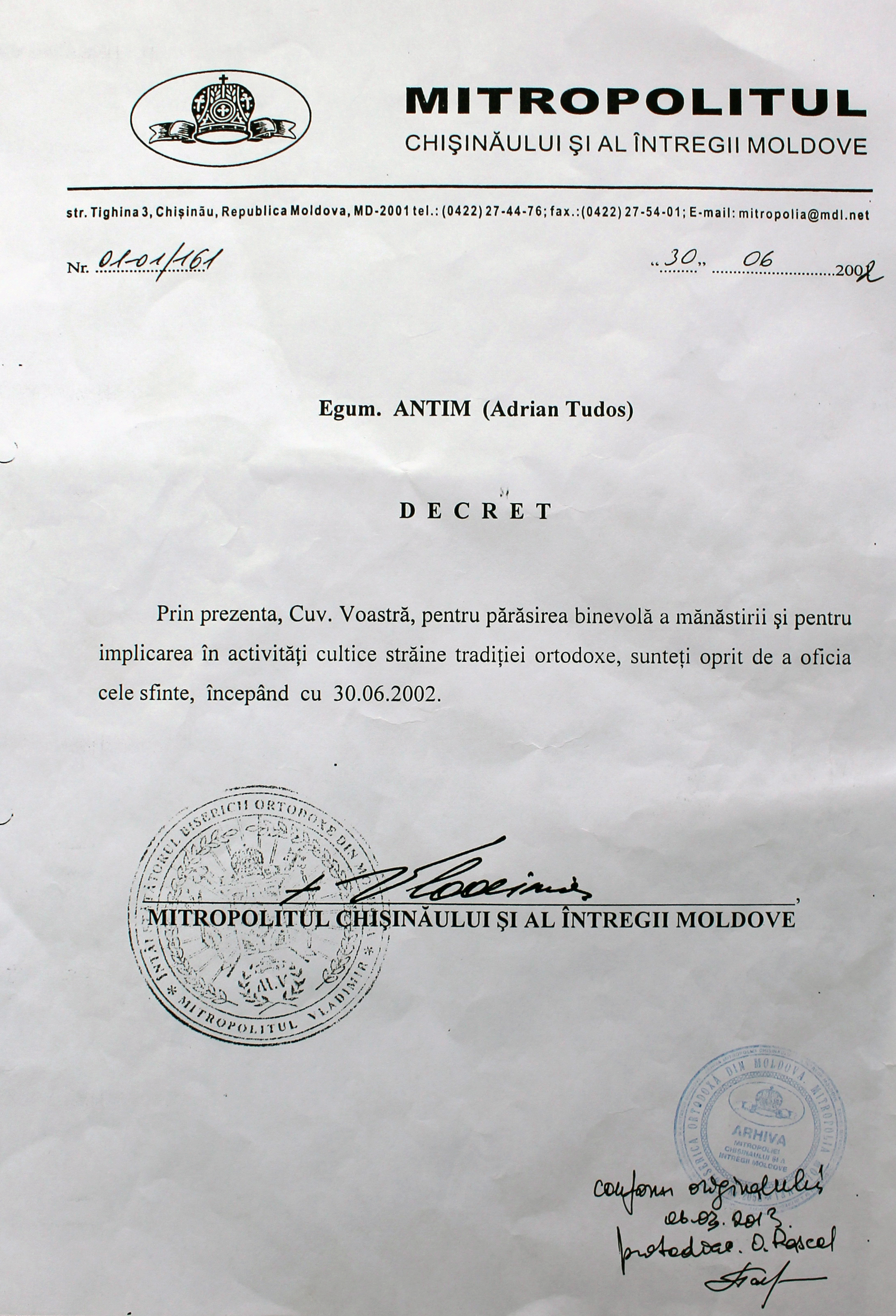 Согласно рапорту Чимишлийского благочинного, митр. прот. Николая Горяну, в селе Сагайдакул Ноу, коммуны Порумбей Чимишлийского района, монах Антим (Тудос), отстраненный от богослужений Высокопреосвященным митрополитом Владимиром еще в 2002 году, самовольно совершает так называемые богослужения (в том числе Святые Таинства), вводя в заблуждение верующих не только вышеупомянутого округа, но всей республики.