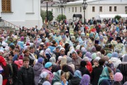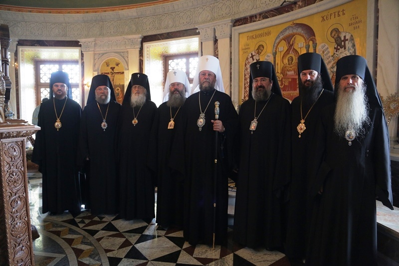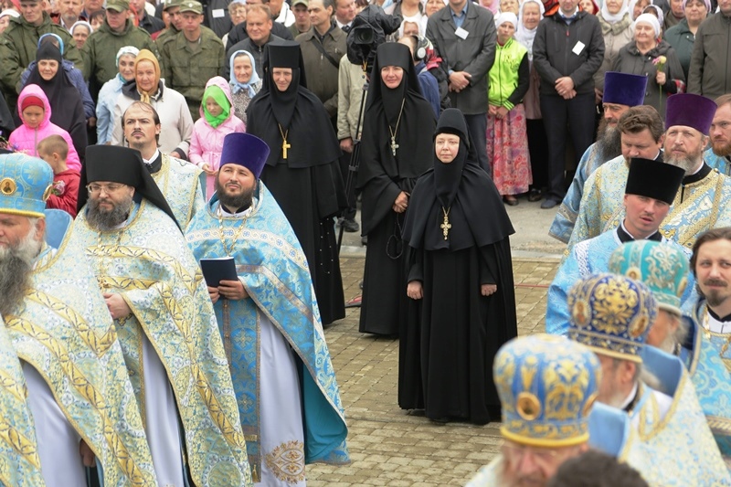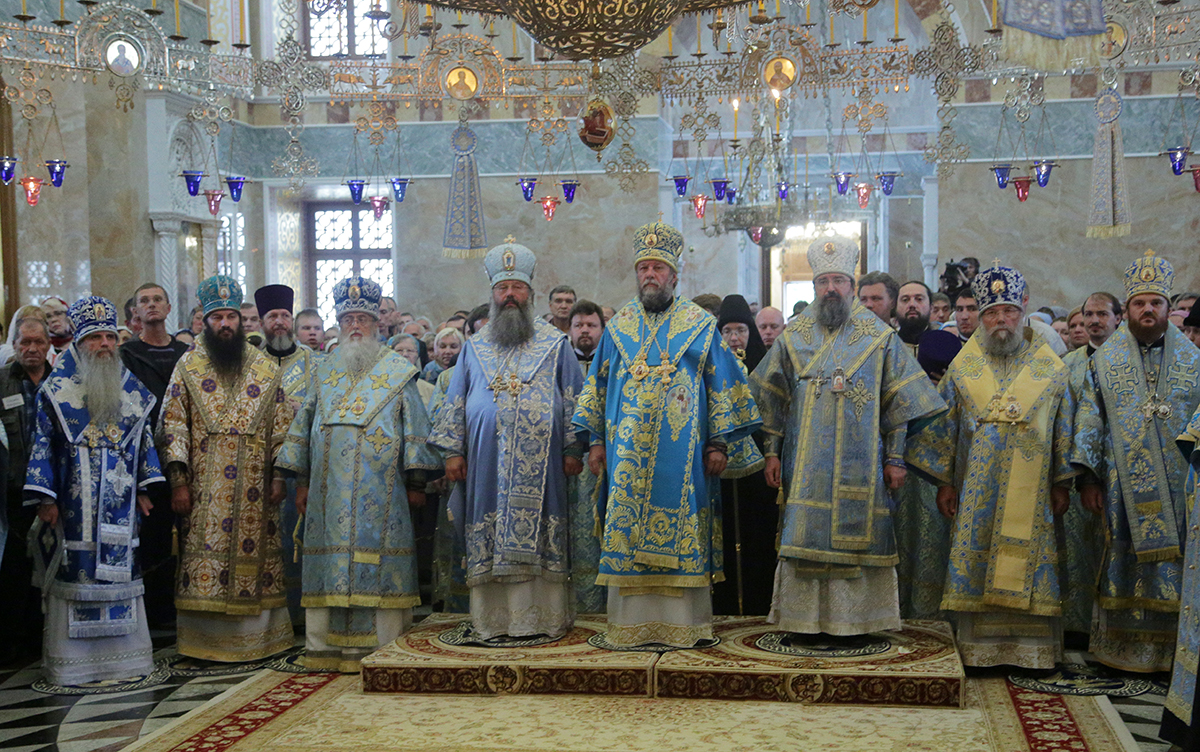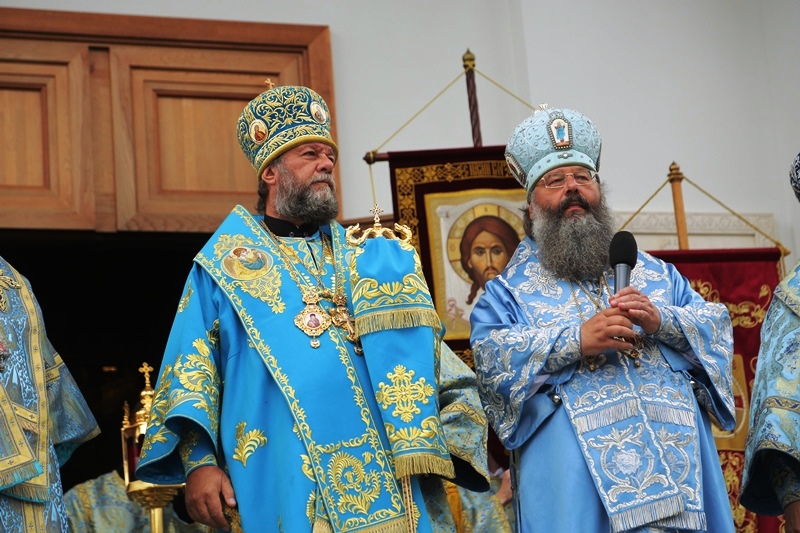 После сугубой ектении была совершена молитва о мире на Украине, а по завершении богослужения сонм архиереев с духовенством и верующими прошли вокруг монастыря крестным ходом во главе с праздничными образами Божией Матери Тихвинской и святого равноапостольного князя Владимира.