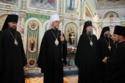 В свою очередь, Высокопреосвященный Митрополит Владимир обратился со словами поздравления к Владыке Савве, пожелав ему крепости сил, духовной бодрости, терпения и помощи Божией в ответственном служении в винограднике Христовом и на молитвенную память подарил владыке Савве букет белых роз и панагию.