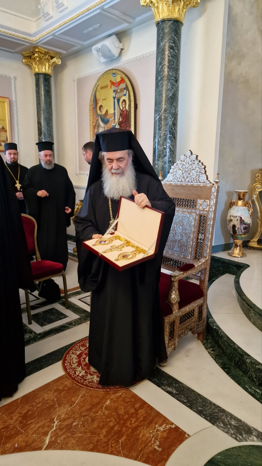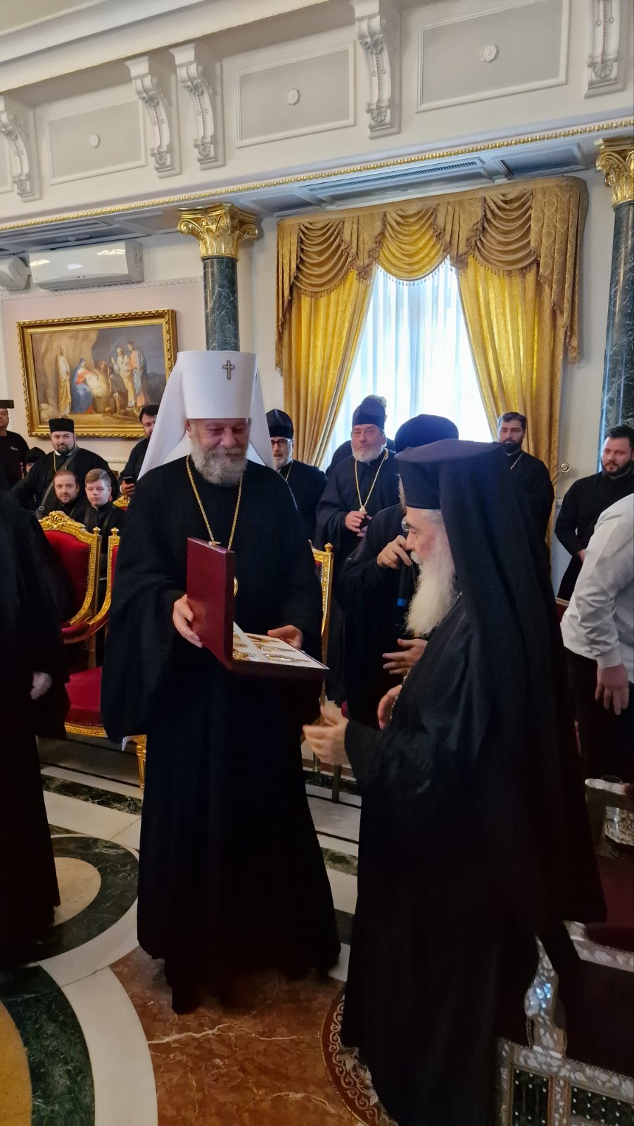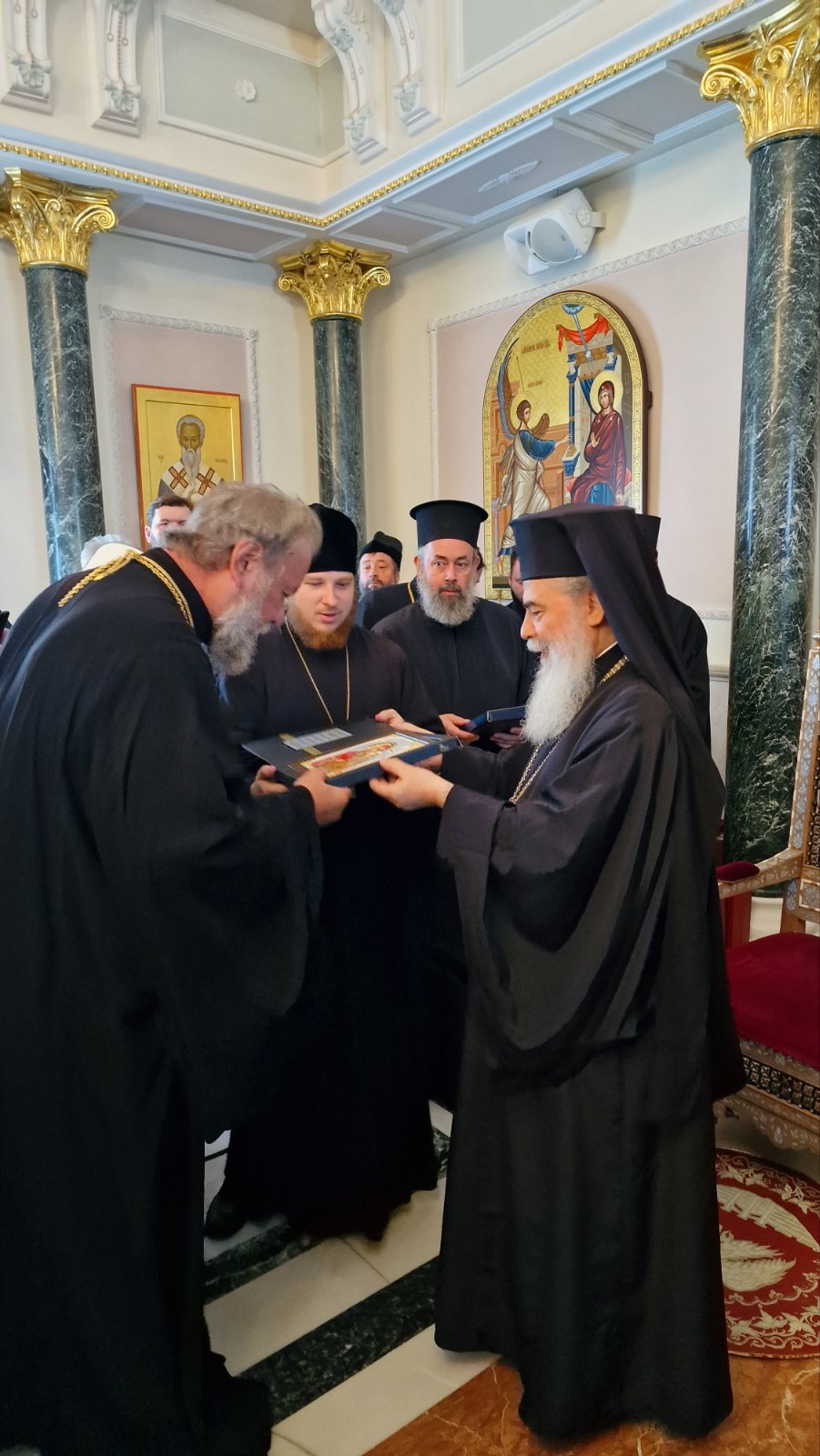 Блаженнейший Патриарх Феофил III сердечно приветствовал гостей, высоко оценив любовь Митрополита Владимира и молдавских паломников к святыням Израиля и Палестины. В знак признательности и с большим благоговением Высокопреосвященный Митрополит Владимир преподнес Блаженнейшему Патриарху Иерусалимскому памятные дары от Православной Церкви Молдовы. В свою очередь, Его Блаженство преподнес молдавским паломникам небольшие иконы с образом Божией Матери «Иерусалимская».