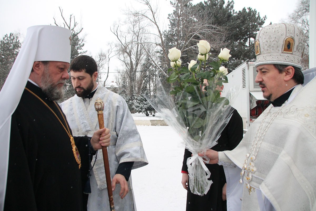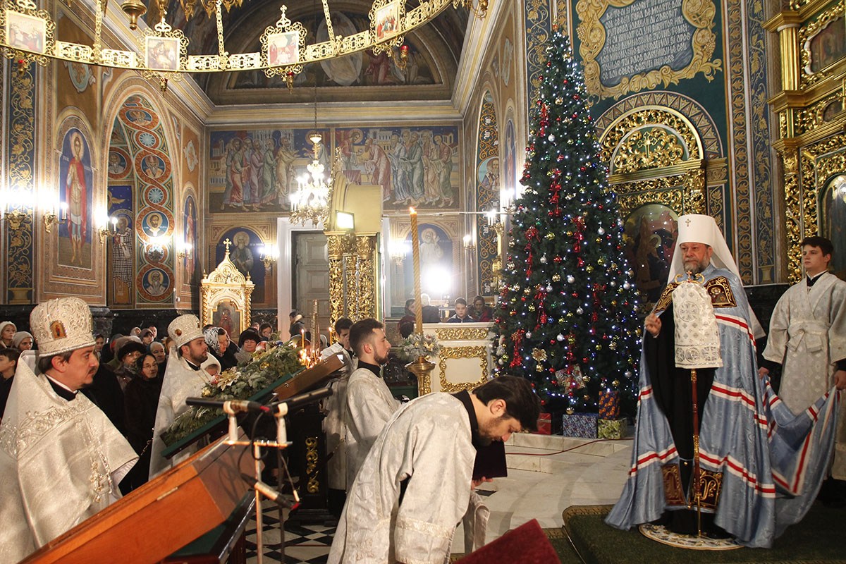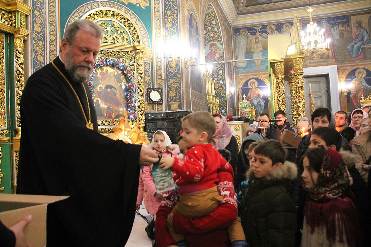 По окончании Литургии Высокопреосвященный Владыка Митрополит поздравил священнослужителей и паству с праздником Рождества Христова, после чего по сложившейся доброй традиции, присутствующие за богослужением дети получили из рук архипастыря сладкие дары, а взрослые — настенные церковные календари.