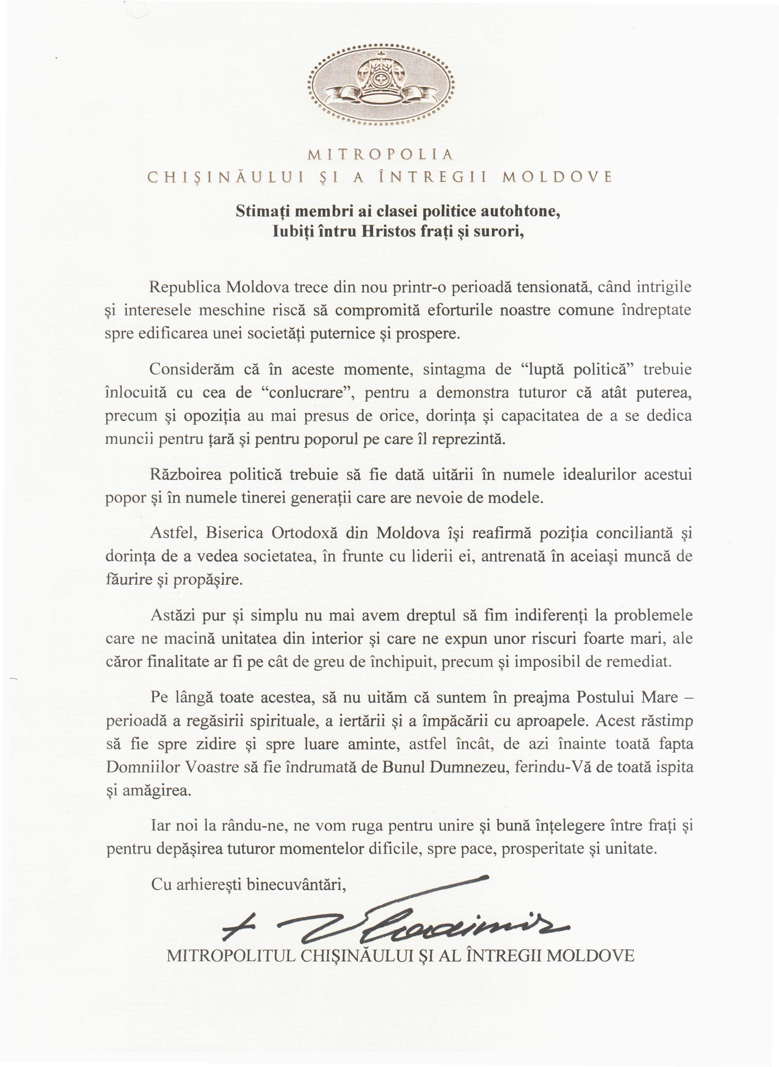 Православная Церковь Молдовы вновь заявляет о своей примирительной позиции и желании увидеть общество во главе с ее лидерами, в созидательном процессе во имя процветания.