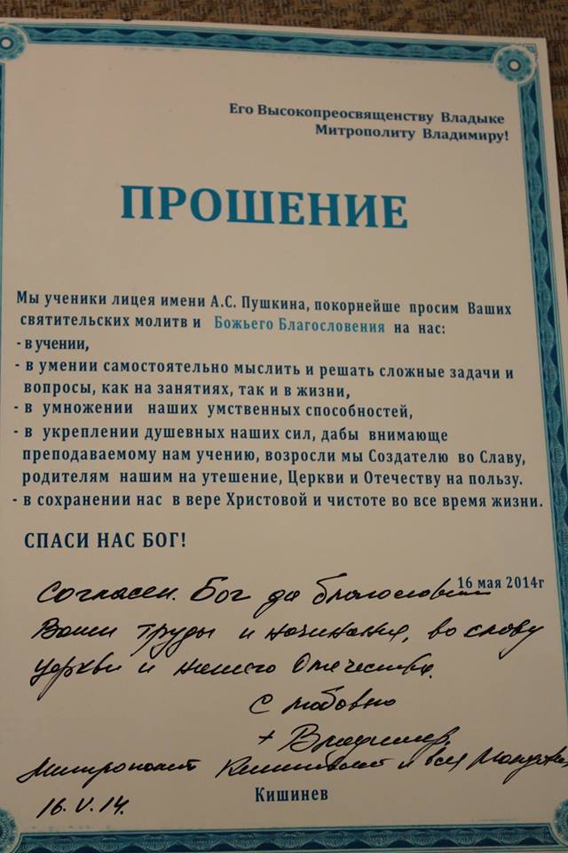 16 мая 2014 года, ученики первых классов столичного лицея им. А. С. Пушкина, в сопровождении преподавателя Натальи Тевяшовой, посетили Епархиальное Управление Кишиневско-Молдавской Митрополии, чтобы ознакомиться с деятельностью учреждения.