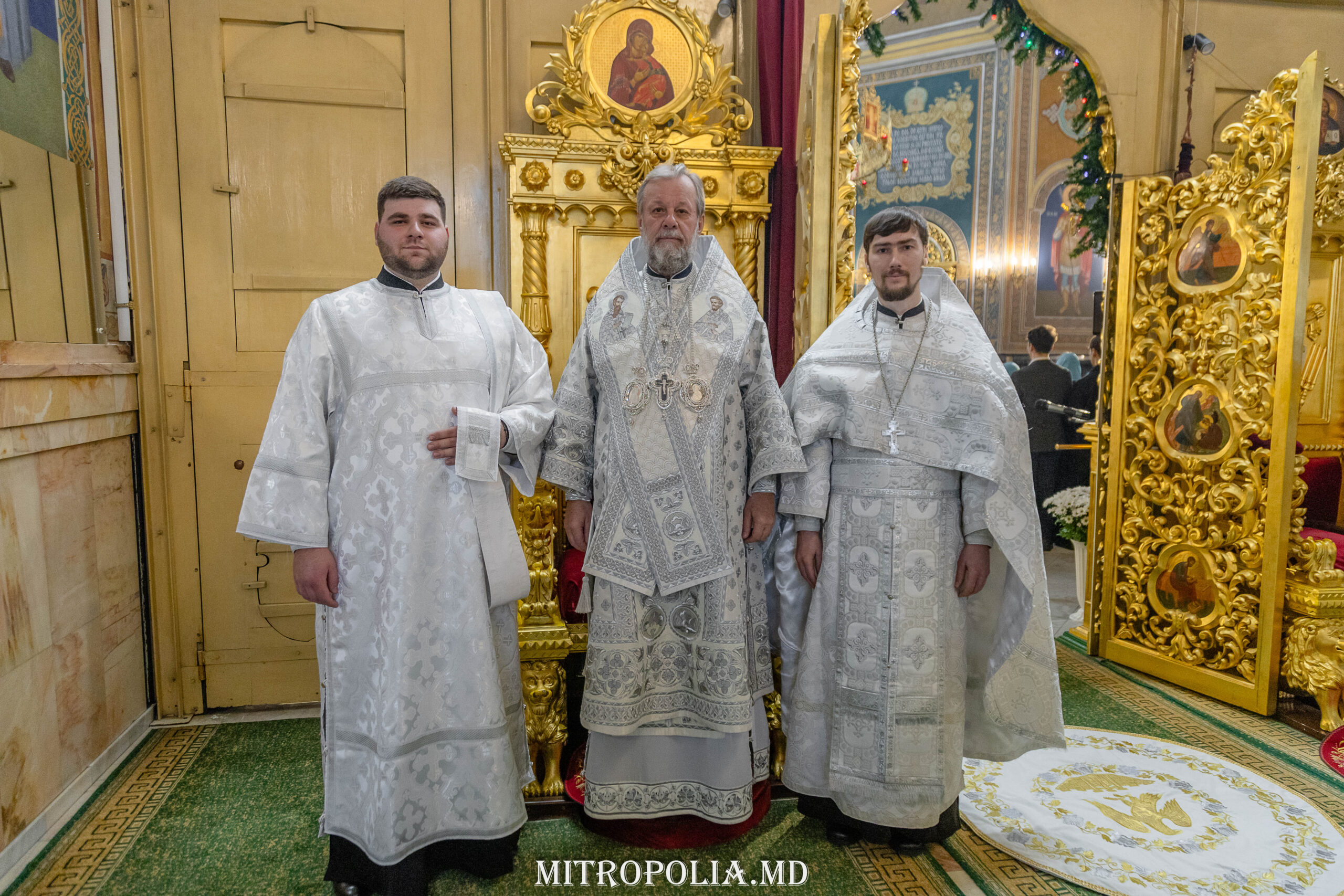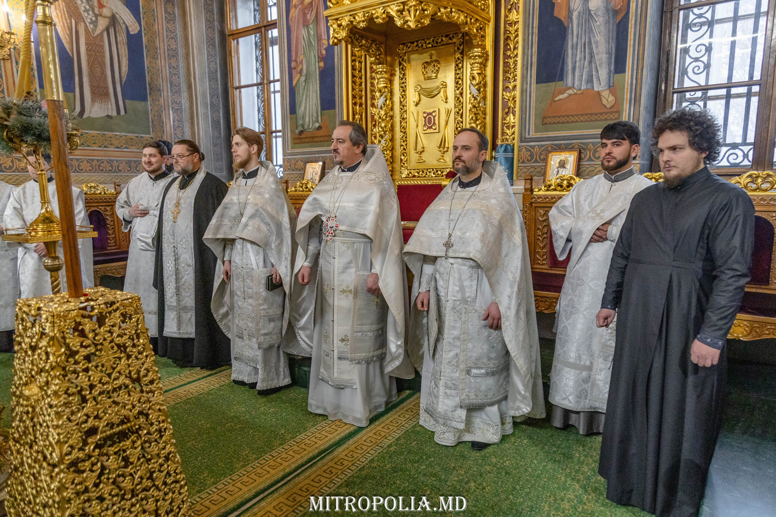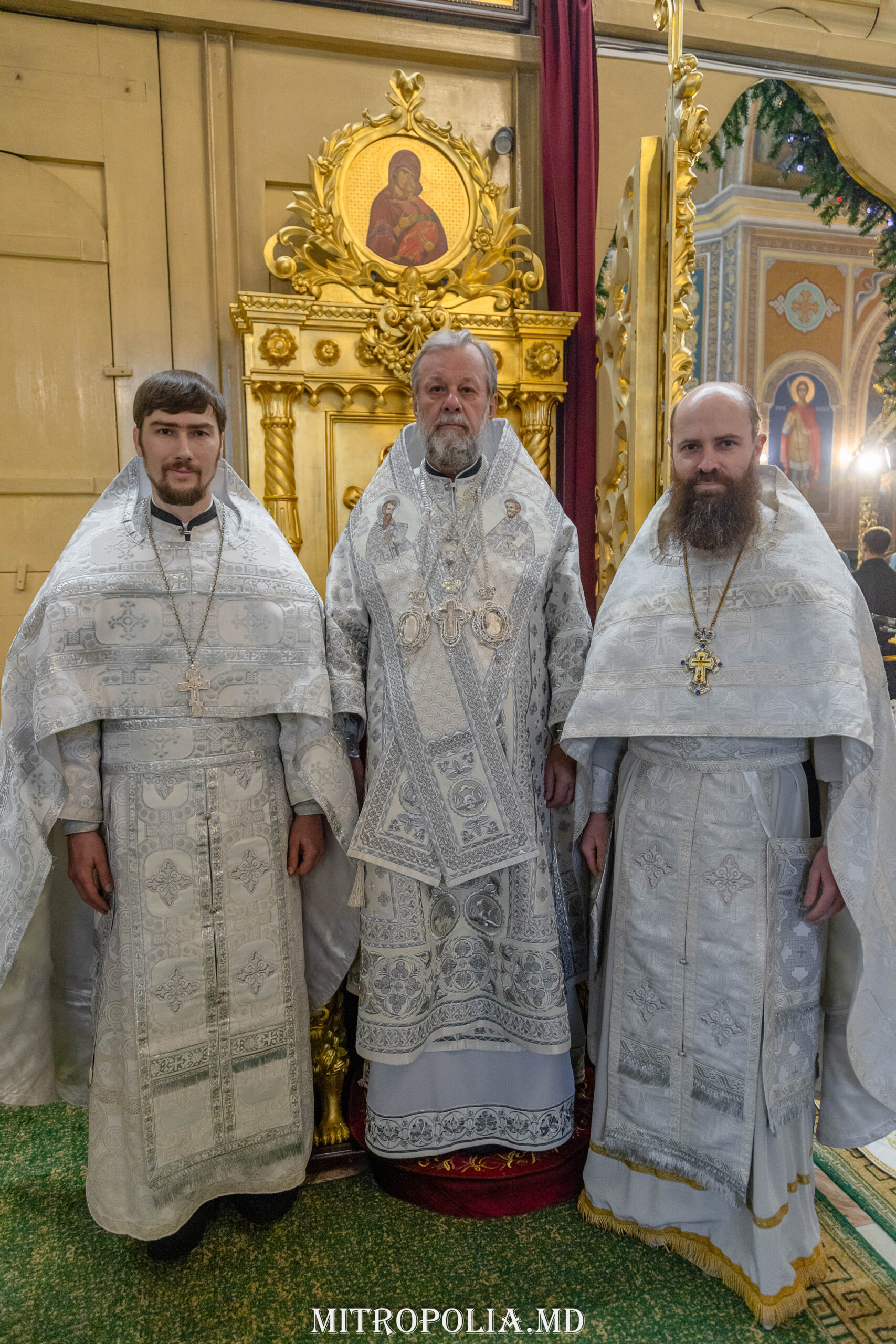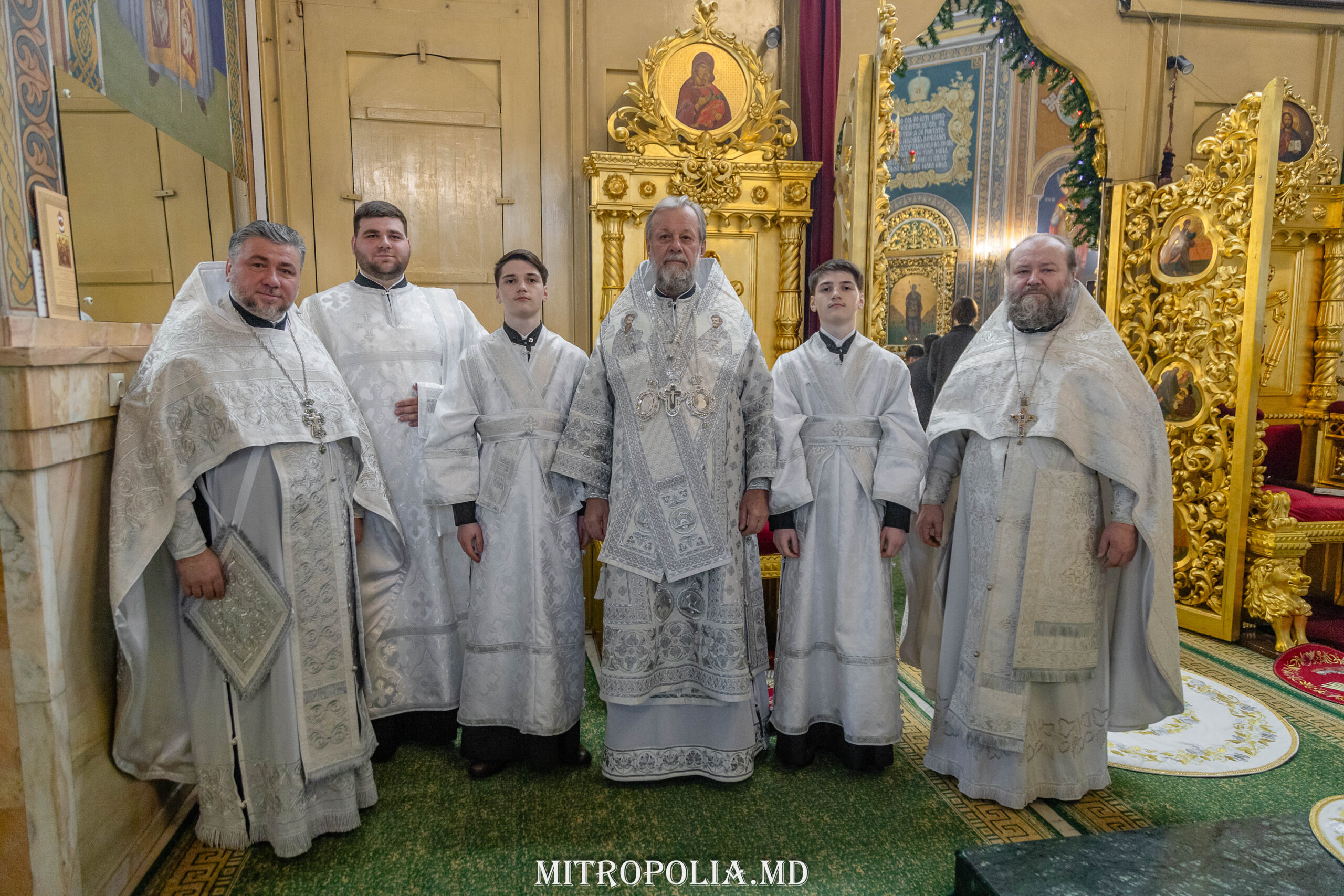 Его Высокопреосвященству сослужили: Преосвященные викарные епископы Сорокский Иоанн, Орхейский Силуан, Кэприянский Филарет, митрофорный протоиерей Вадим Кейбаш, секретарь Молдавской митрополии, архимандрит Николай (Рошка), председатель Синодального отдела по взаимоотношению с учреждениями МВД, Вооруженными силами и Правоохранительными органами и духовник-администратор Кишиневского Феодоро-Тироновского Чуфлинского женского монастыря, митрофорный протоиерей Игорь Мэмэлигэ, настоятель Димитриевского храма г. Вадул-луй-Водэ Кишиневского муниципия, соборное духовенство.
